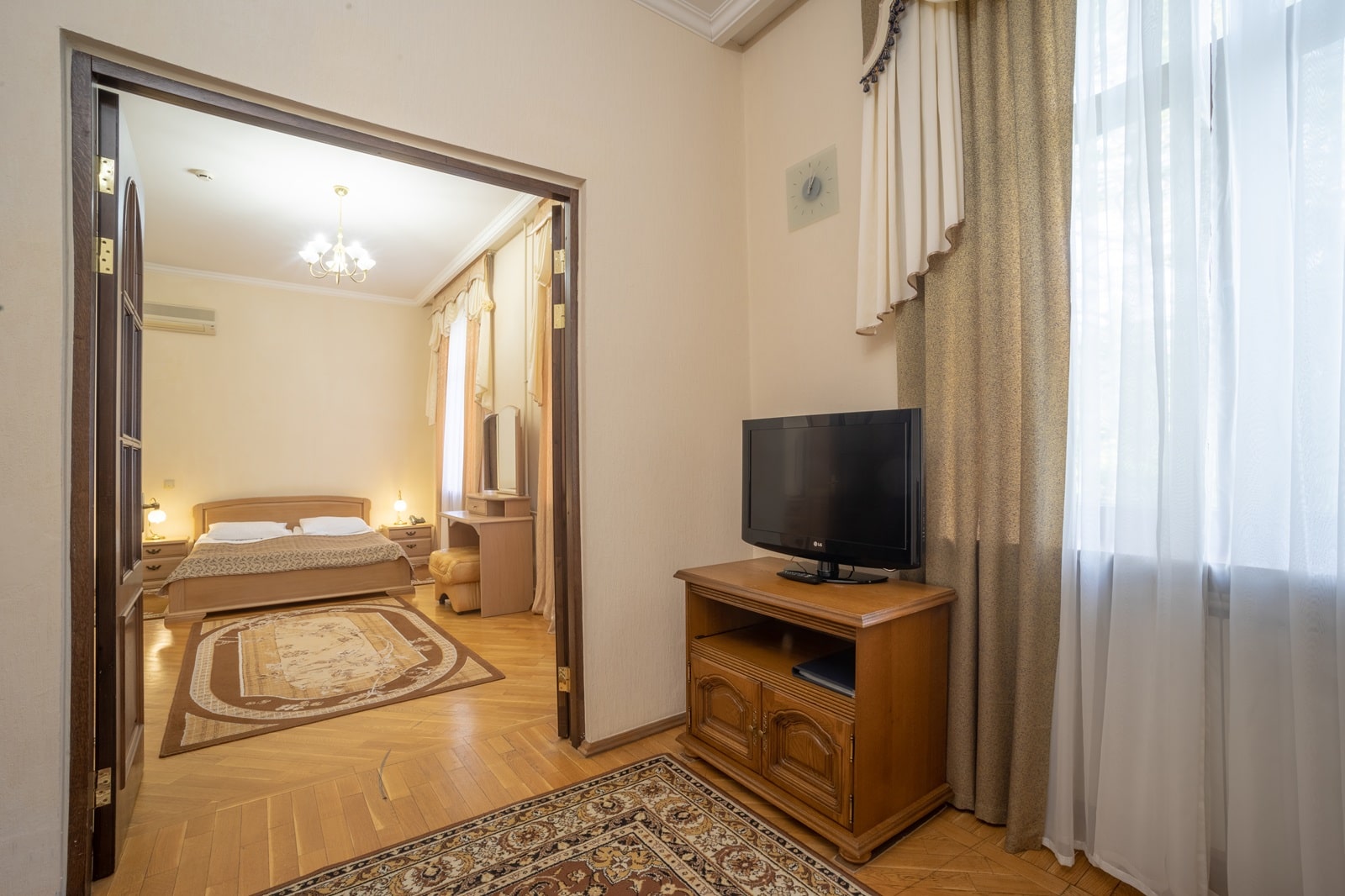 Площадь номера - 30-32 кв.м. 2 осн. места. 2 доп. места. Мебель: вешалка, диван раскладной, зеркало, кресло, кровать двуспальная, прикроватные тумбочки, пуфик, стол, столик журнальный, тумба под телевизор, шкаф. Оборудование: мини-холодильник, сейф, сплит-система, телевизор, телефон, чайный набор посуды, электрочайник. Санузел: с душем, туалетные принадлежности, фен. Сервис: Wi-Fi бесплатно, смена полотенец, смена постельного белья, уборка номера, услуги внутренней телефонной связи.