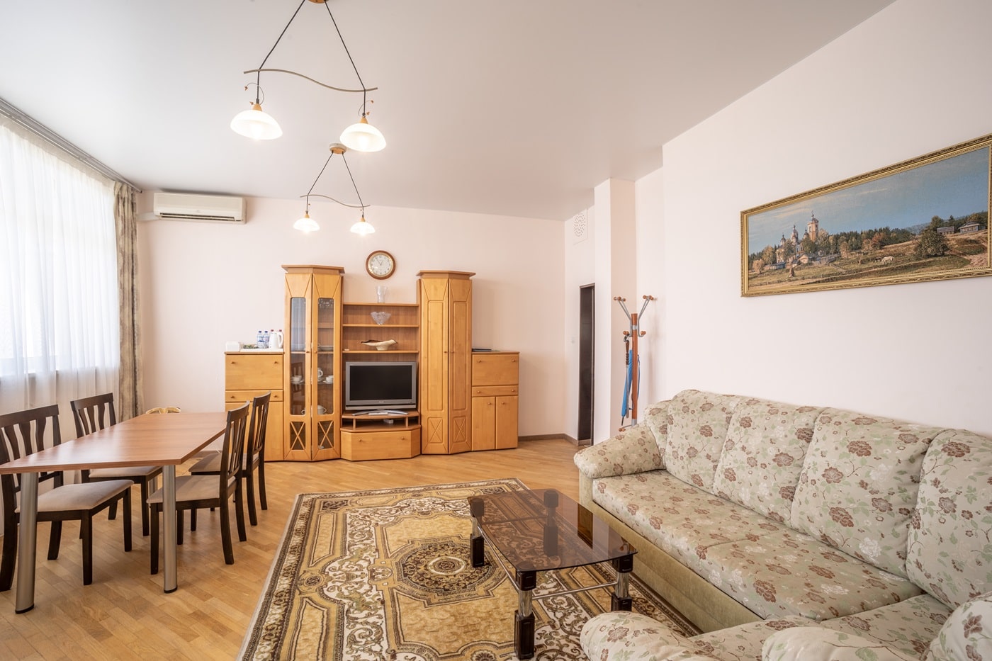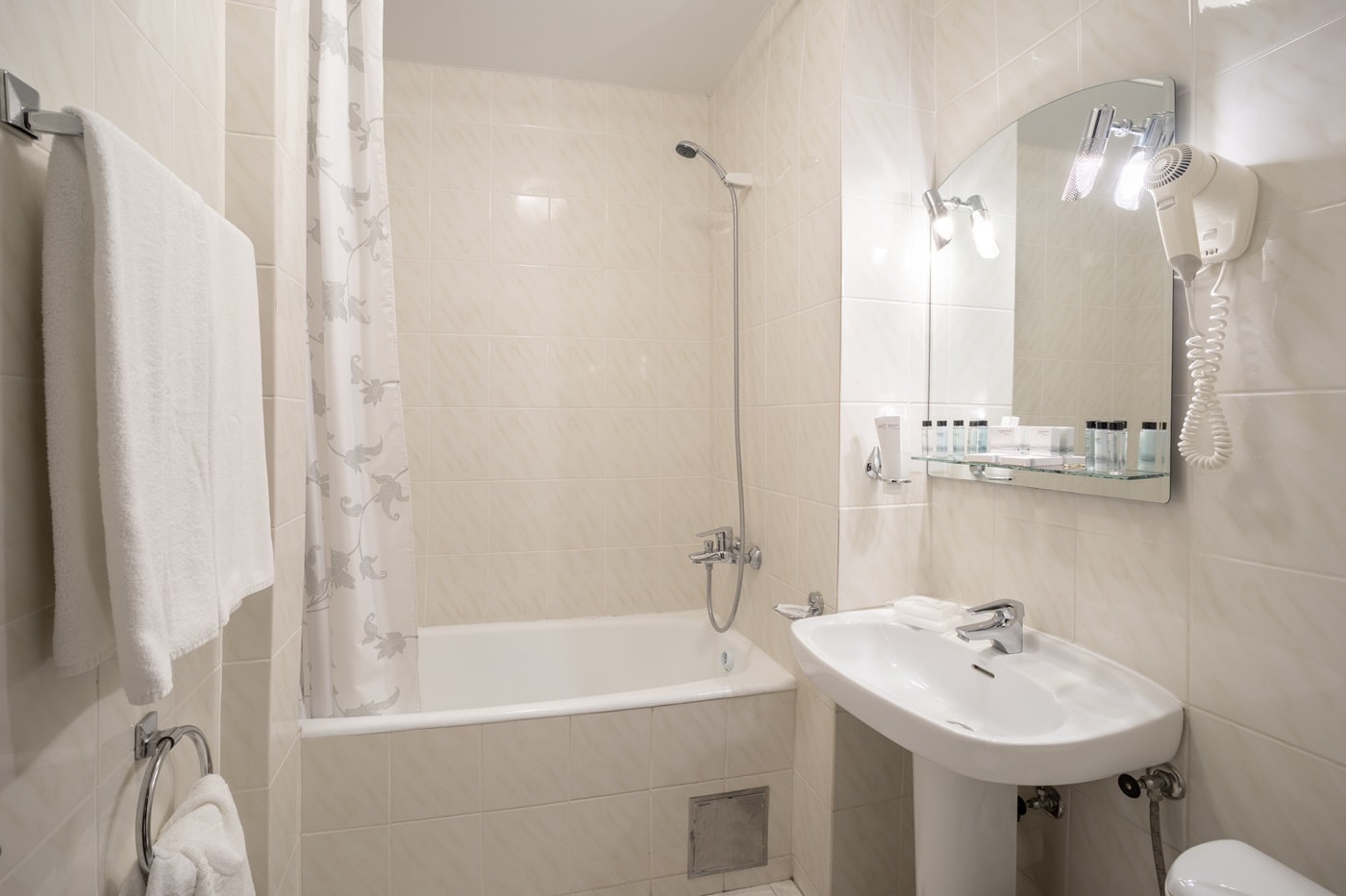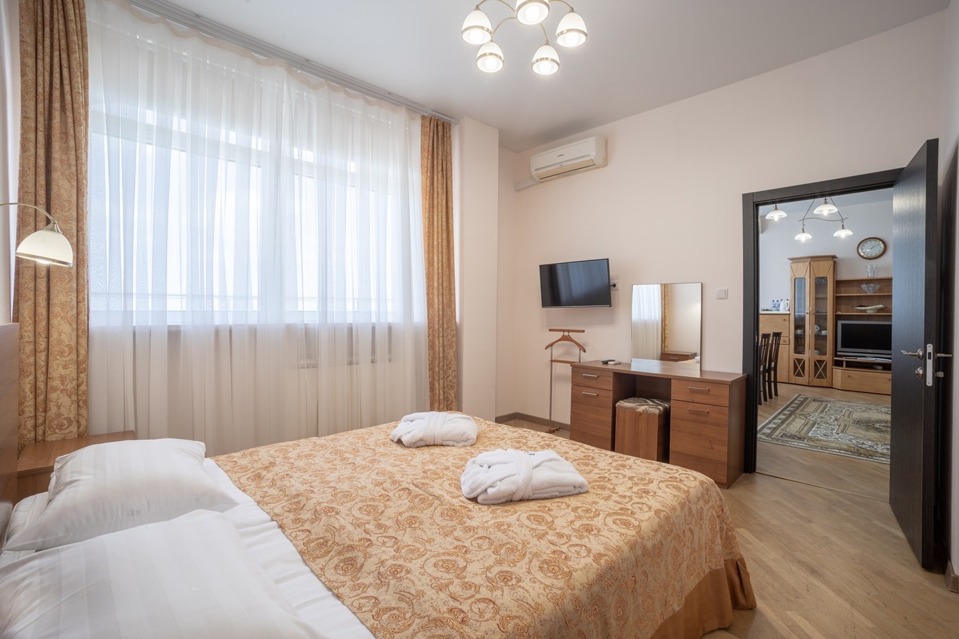 2 осн. места. 2 доп. места. В номере хорошая мебель: французская кровать и диван, сервант, журнальный столик, сервант, телевизоры, телефон, холодильник, сплит – система, электрочайник, платяной шкаф. В ванной: душевая кабина, современная сантехника, фен, набор гостеприимства, набор полотенец, банные халаты, тапочки. Окна номеров выходят на море.