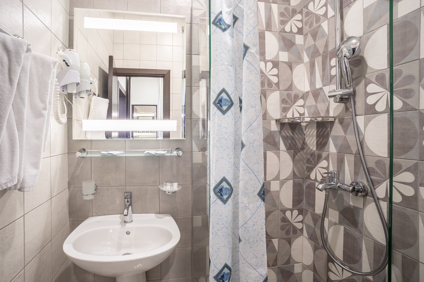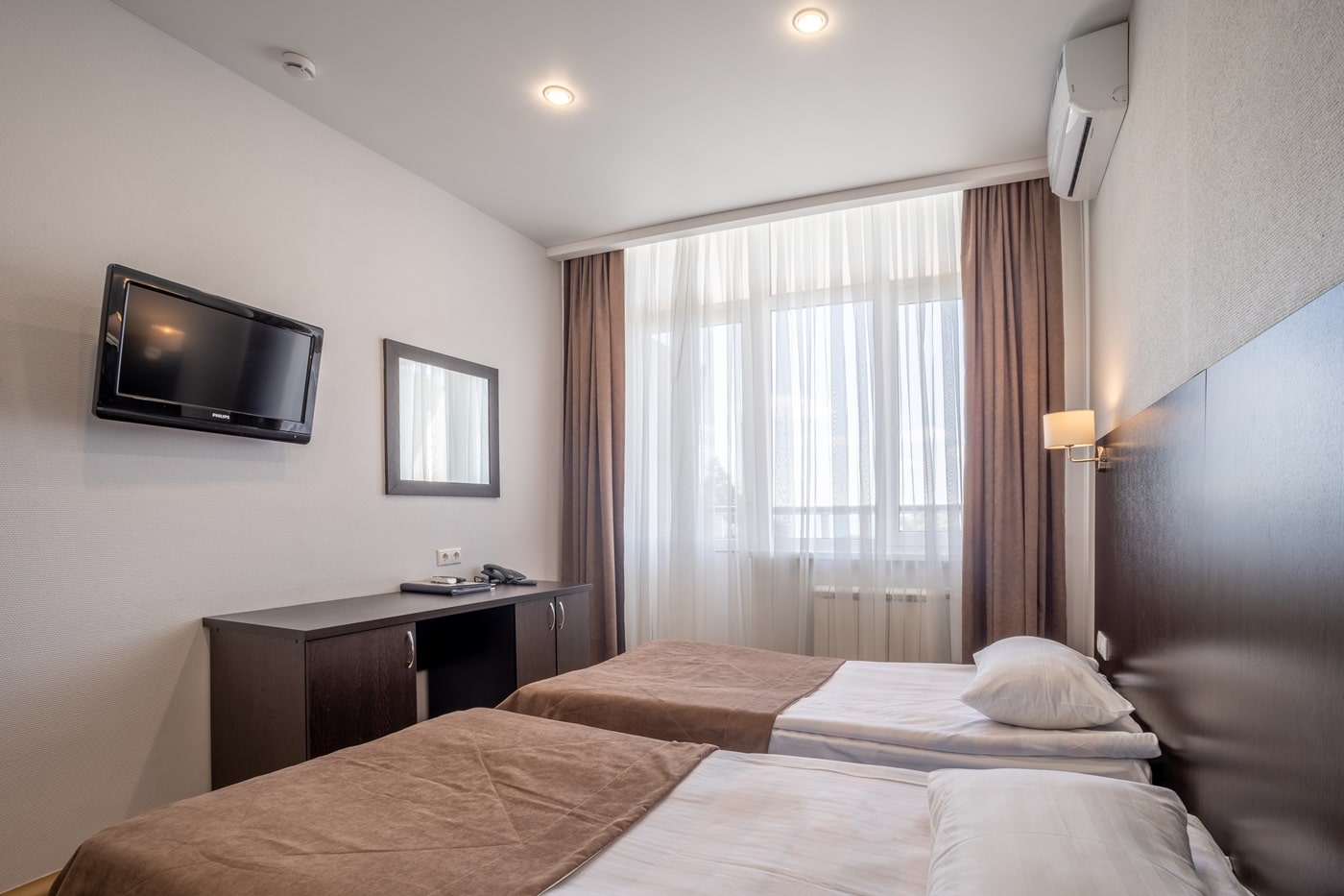 Площадь номера - 12 кв.м. 2 осн. места. 1 доп. место. Балкон. Мебель: вешалка, зеркало, кровати односпальные /одна двуспальная кровать, прикроватные тумбочки, стол, стулья, шкаф. Оборудование: мини-холодильник, сплит-система, телевизор, телефон, чайный набор посуды, электрочайник. Санузел: с душем, туалетные принадлежности, фен. Сервис: Wi-Fi бесплатно, смена полотенец, смена постельного белья, уборка номера, услуги внутренней телефонной связи.