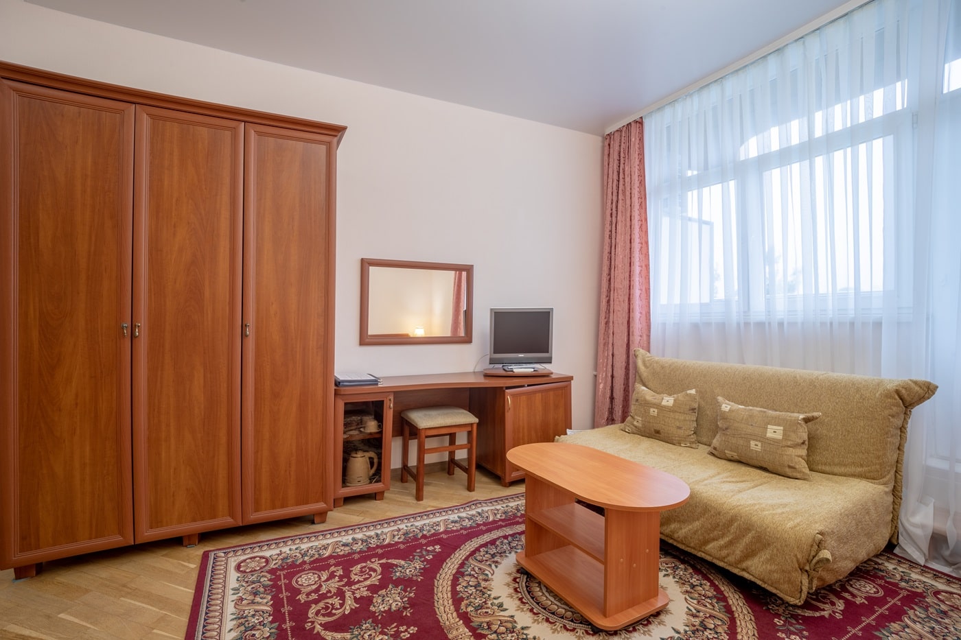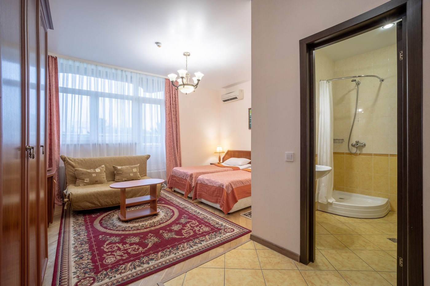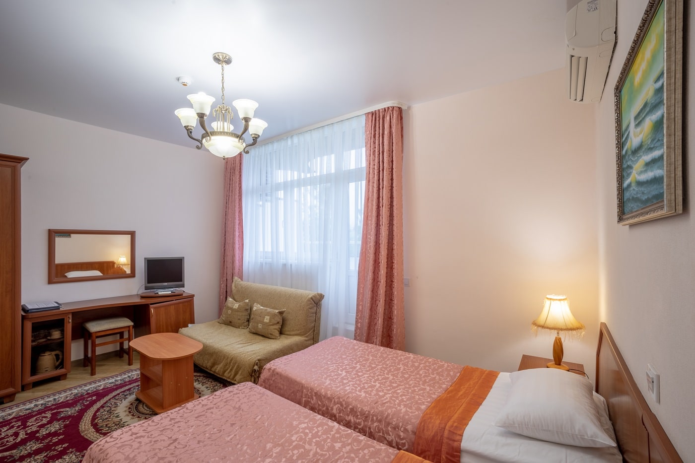 Площадь номера - 12 кв.м. 2 осн. места. 1 доп. место. Балкон. Мебель: вешалка, зеркало, кровати односпальные (2), прикроватные тумбочки, стол, стул, шкаф. Оборудование: мини-холодильник, сплит-система, телевизор, телефон, чайный набор посуды, электрочайник. Санузел: с душем, туалетные принадлежности, фен. Сервис: Wi-Fi бесплатно, смена полотенец, смена постельного белья, уборка номера, услуги внутренней телефонной связи.