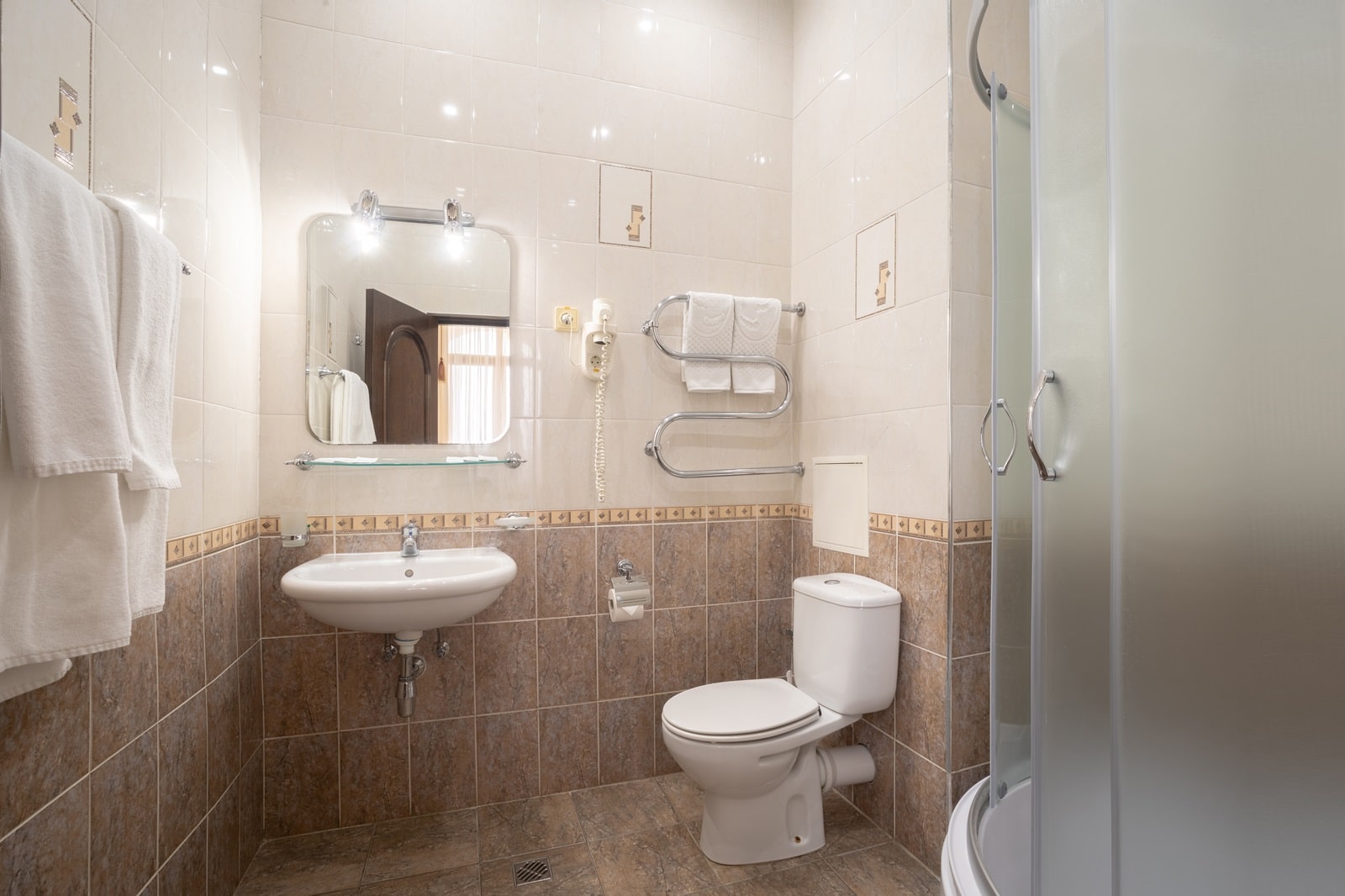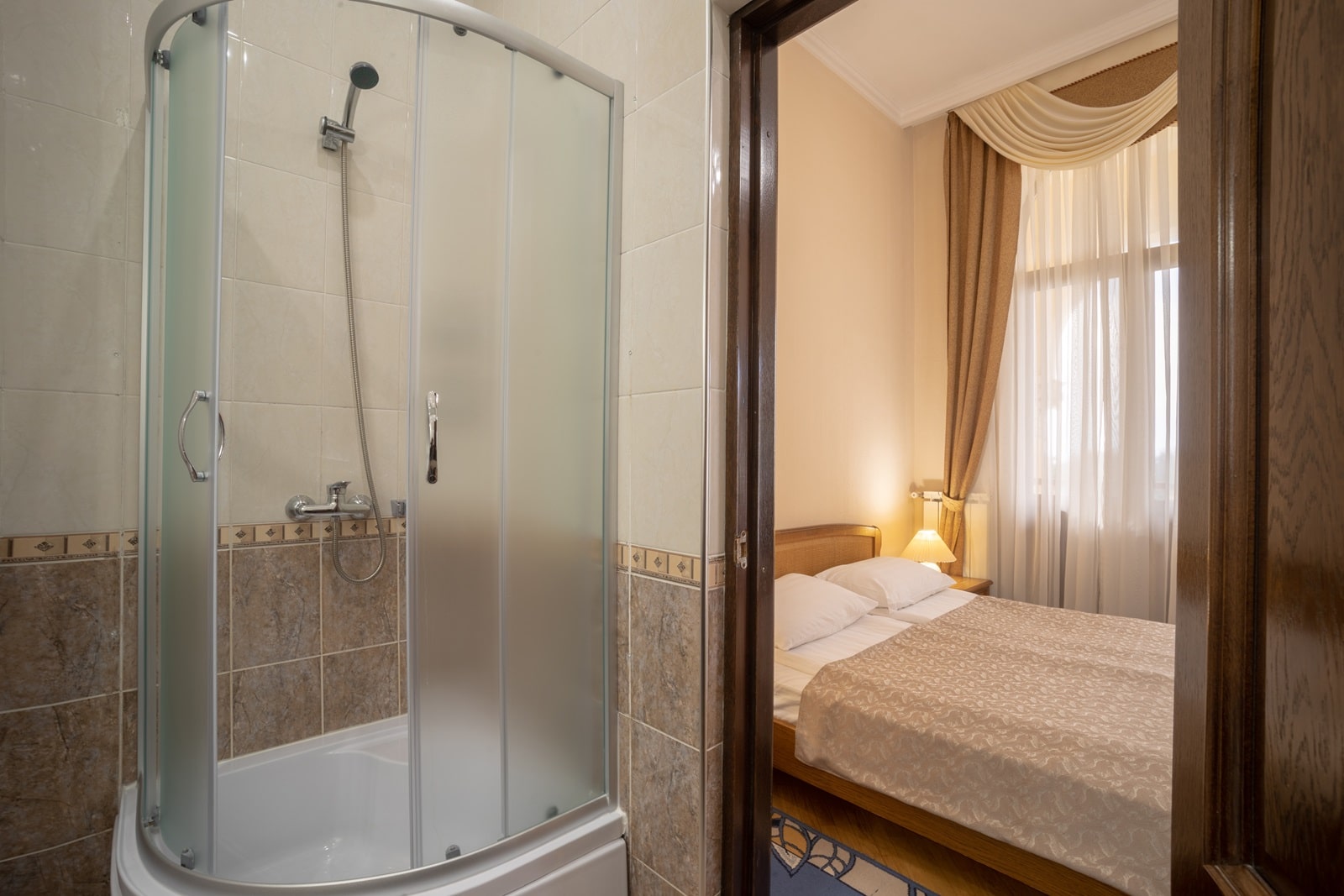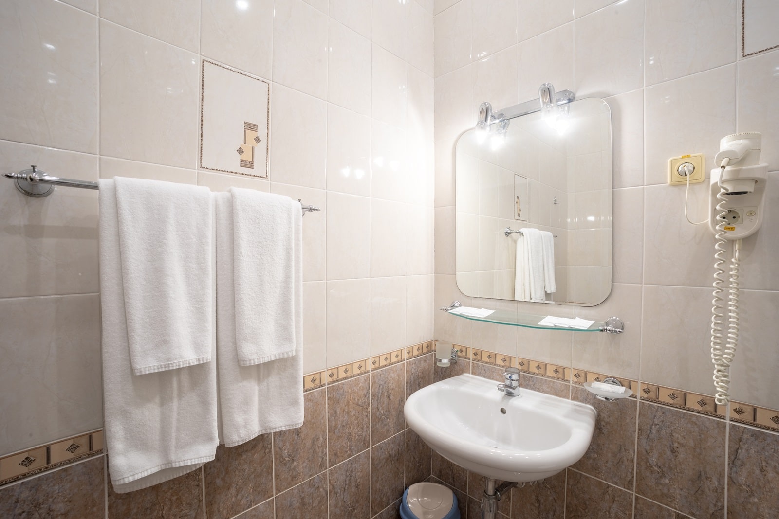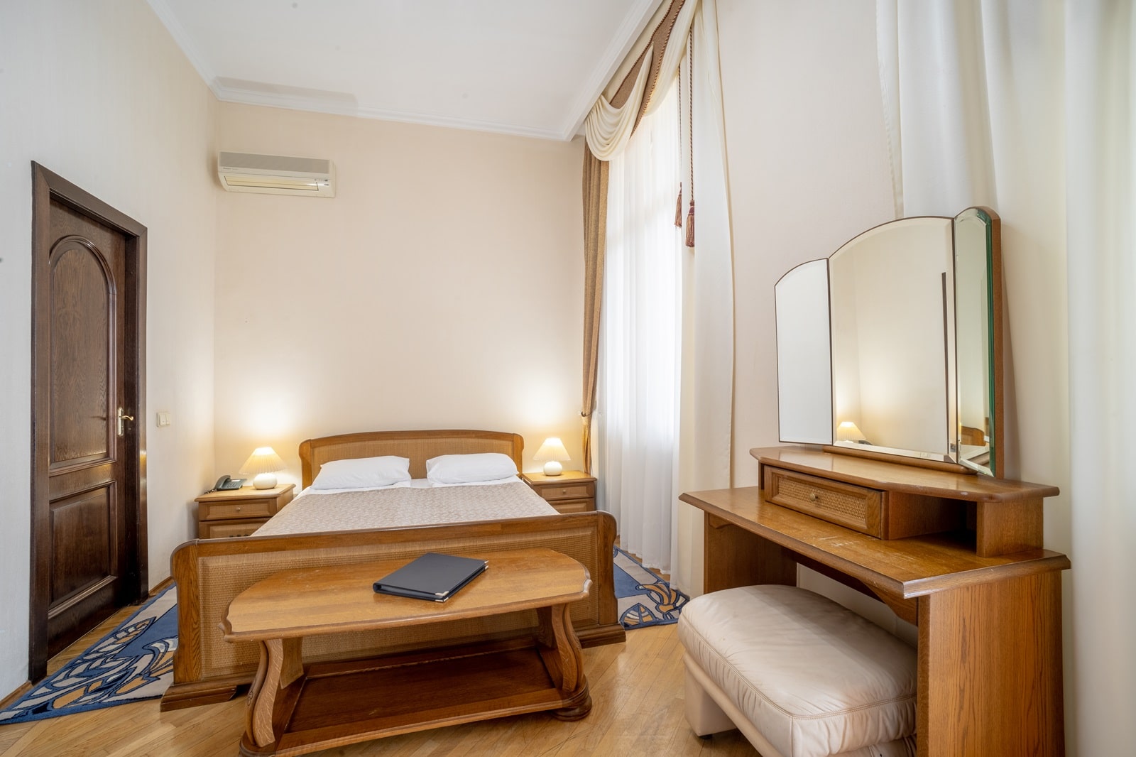 Площадь номера - 22-25 кв.м. 2 осн. места. 2 доп. места. Балкон. Мебель: вешалка, диван раскладной, зеркало, комод, кровать двуспальная, прикроватные тумбочки, пуфик, столик журнальный, столик туалетный, шкаф. Оборудование: мини-холодильник, сплит-система, телевизор, телефон, чайный набор посуды, электрочайник. Санузел: с душем, туалетные принадлежности, фен. Сервис: Wi-Fi бесплатно, смена постельного белья, уборка номера, услуги внутренней телефонной связи, услуги междугородней телефонной связи.