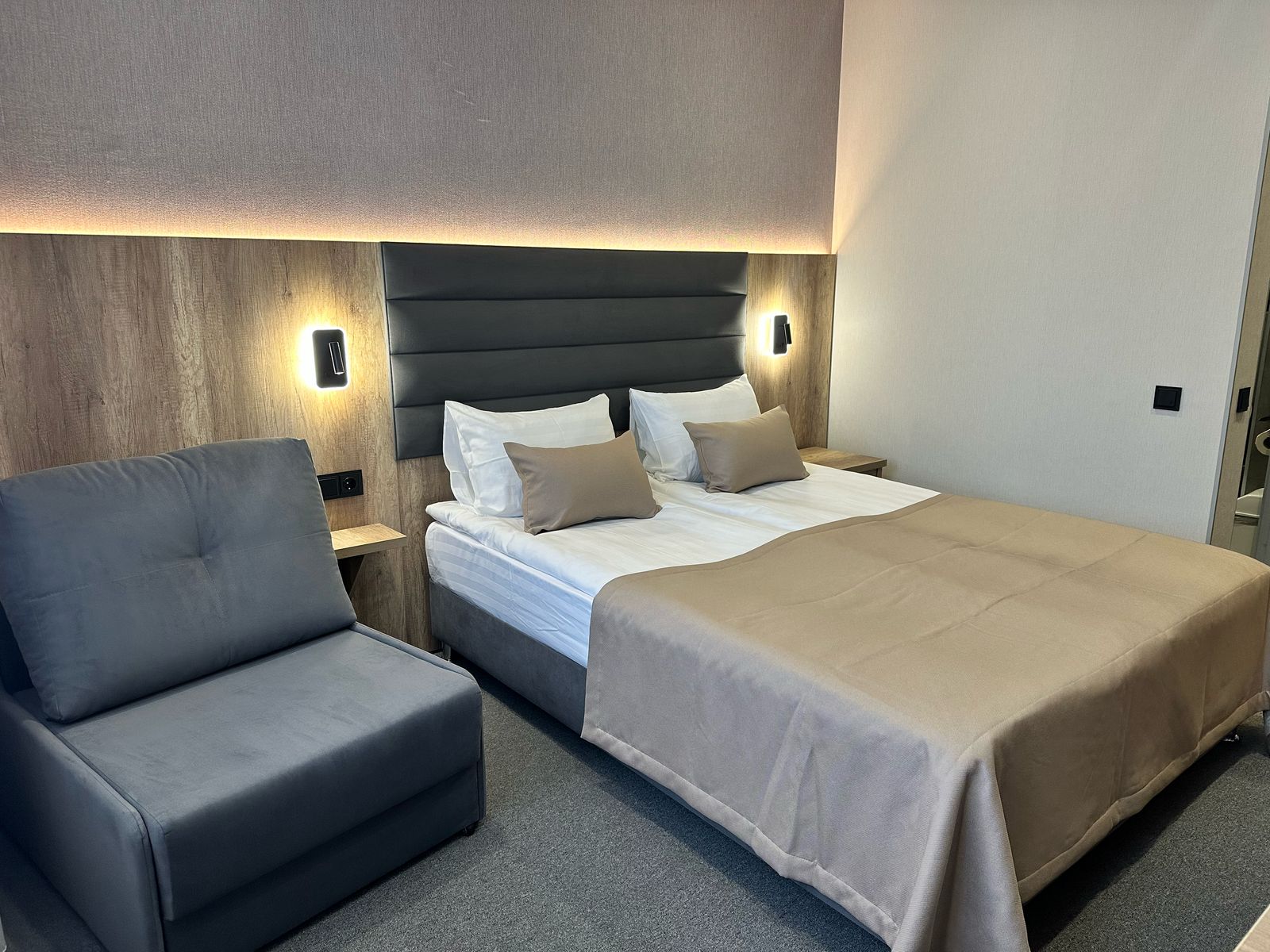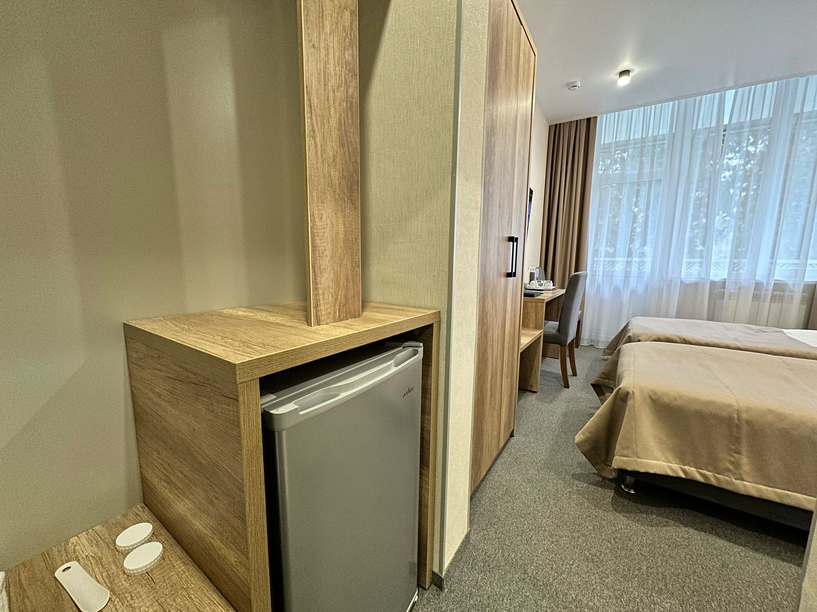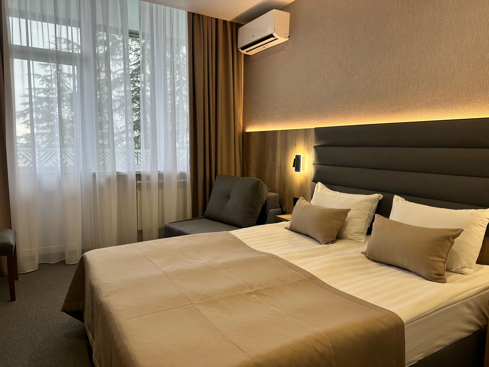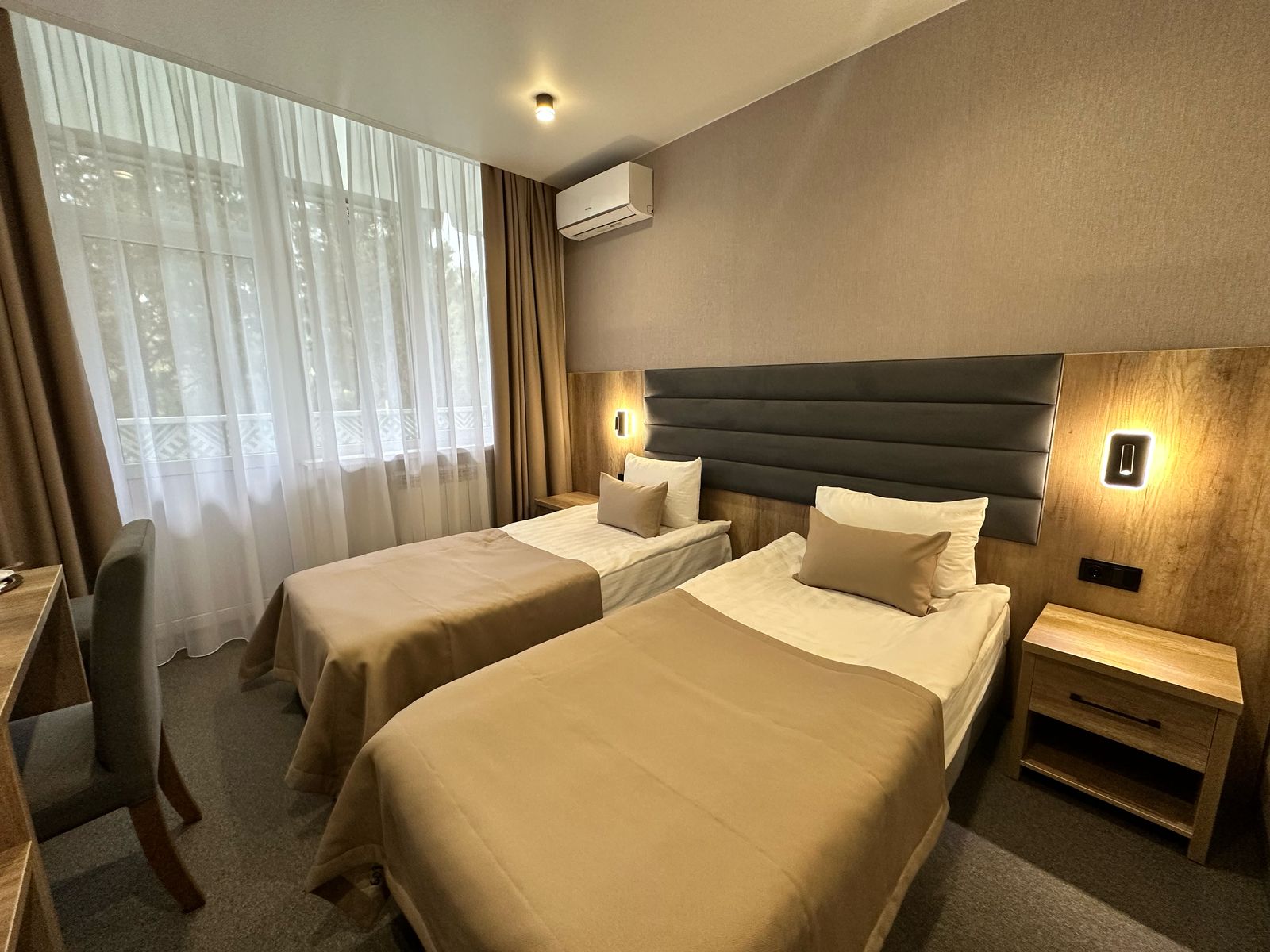 2 осн. места. В номере: две односпальные кровати или одна двуспальная, телевизор, телефон, холодильник, сейф сплит – система, электрочайник, кресло. В ванной: душ, умывальник, унитаз, фен, набор полотенец. Окна номера выходят на море либо парк.