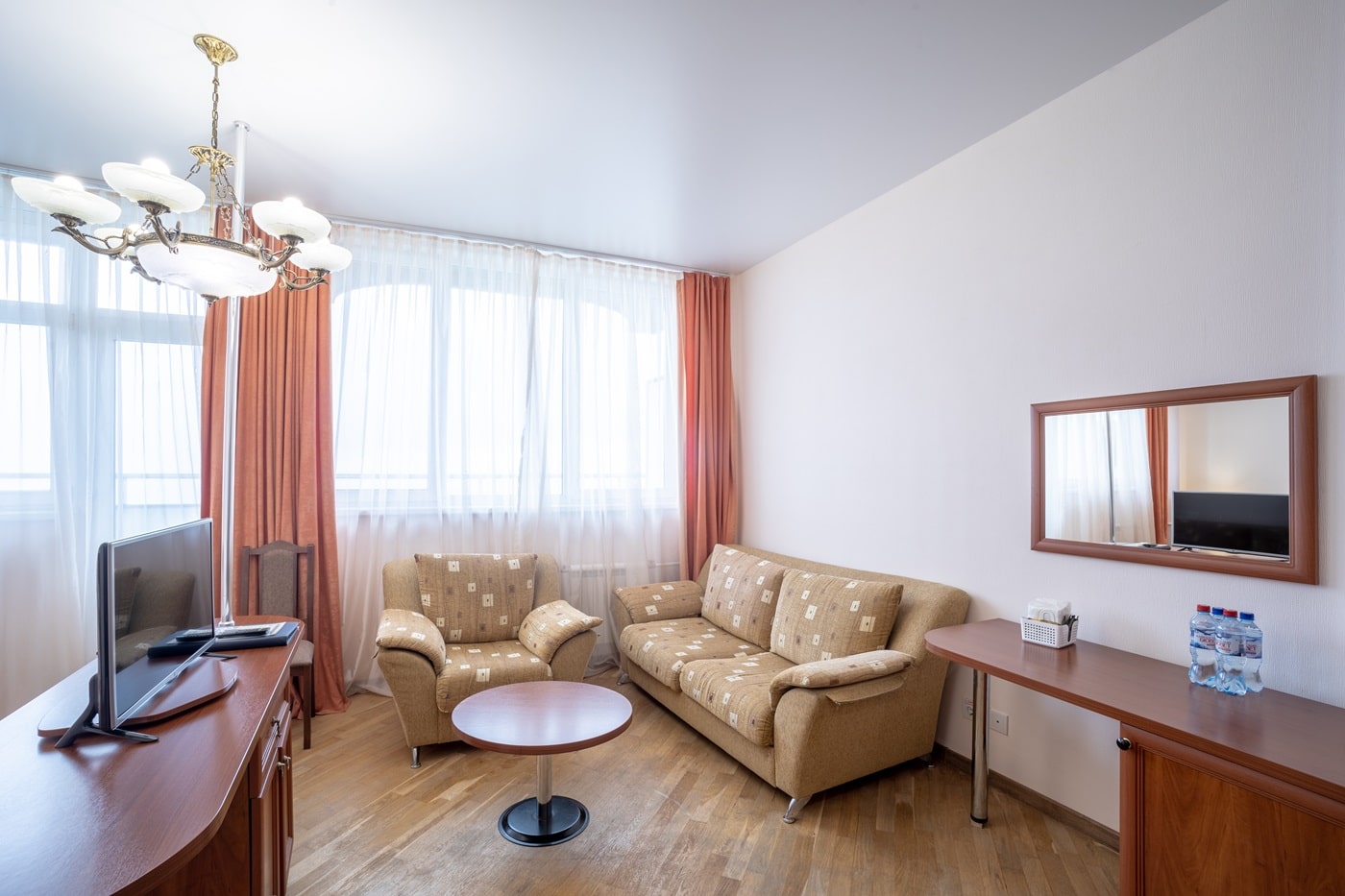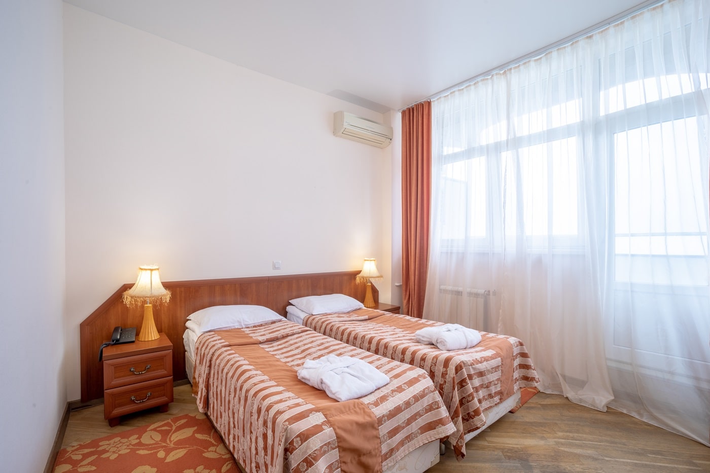 2 осн. места. 1 доп. место. В номере: две односпальные кровати, (возможно установить дополнительное место – кресло-кровать), телевизор, телефон, холодильник, сплит – система, электрочайник, платяной шкаф. В ванной: душ, умывальник, унитаз, набор полотенец, фен. Окна номера выходят на море.