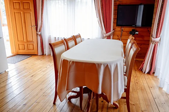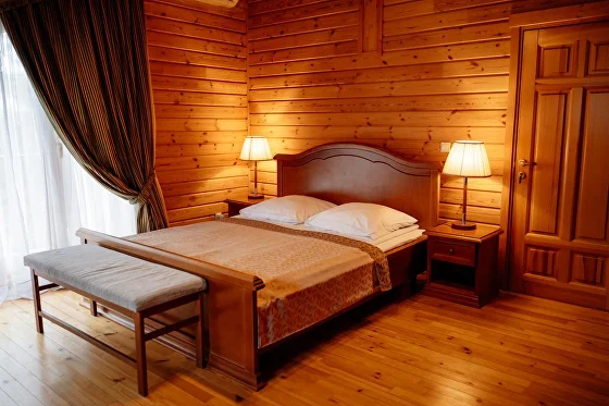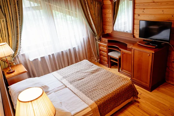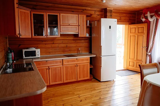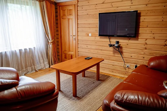 В коттедже: оборудованная мебелью и бытовой техникой кухня-столовая, гостиная, прихожая, сауна с комнатой отдыха, телевизоры со спутниковыми каналами, открытая терраса с ротанговой мебелью, мангал. На втором этаже располагаются две спальни с двуспальной кроватью и с 2мя односпальными кроватями