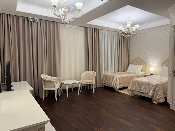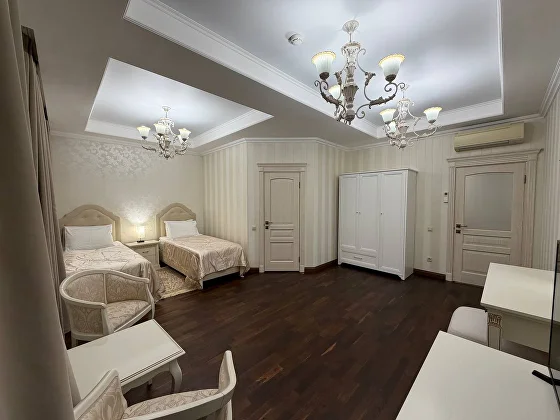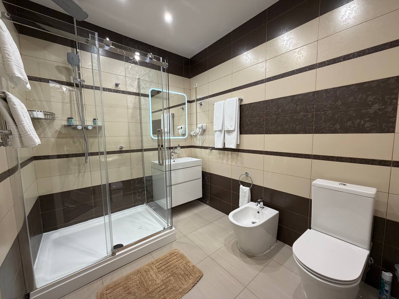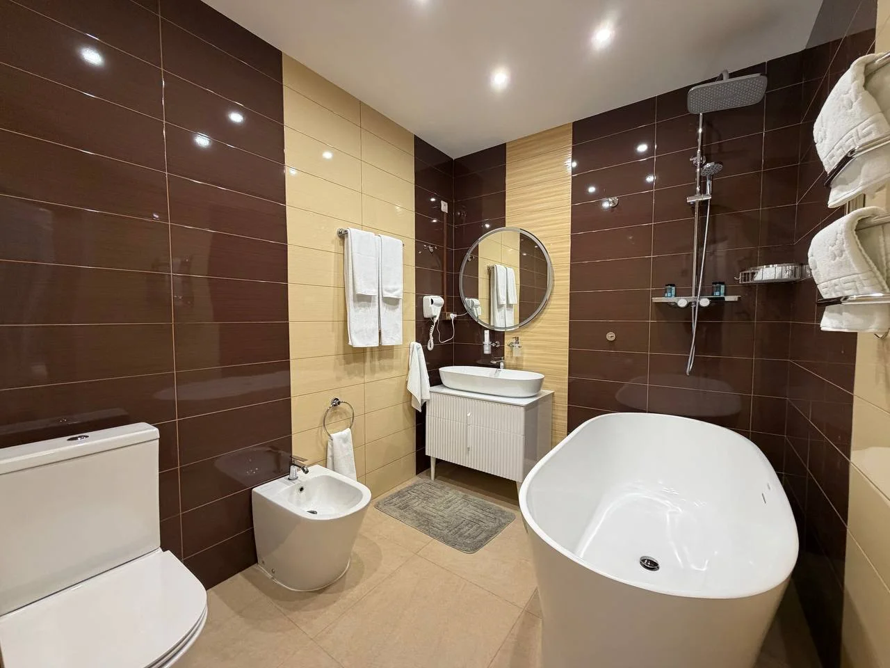 В одной ванной комнате: душевая кабина, в другой — ванна. Ванные комнаты оборудованы: биде, фен, наборы ванных принадлежностей, наборы полотенец, банные халаты, тапочки