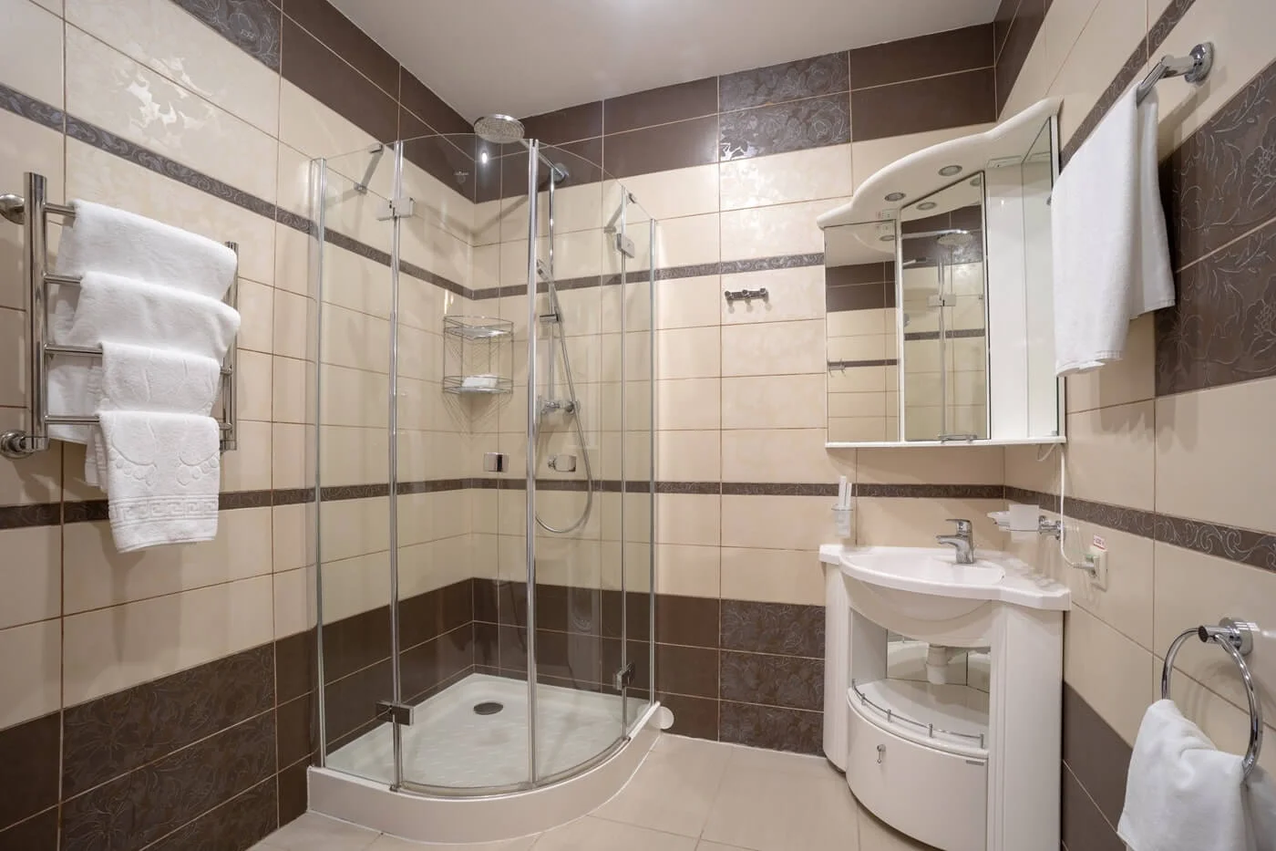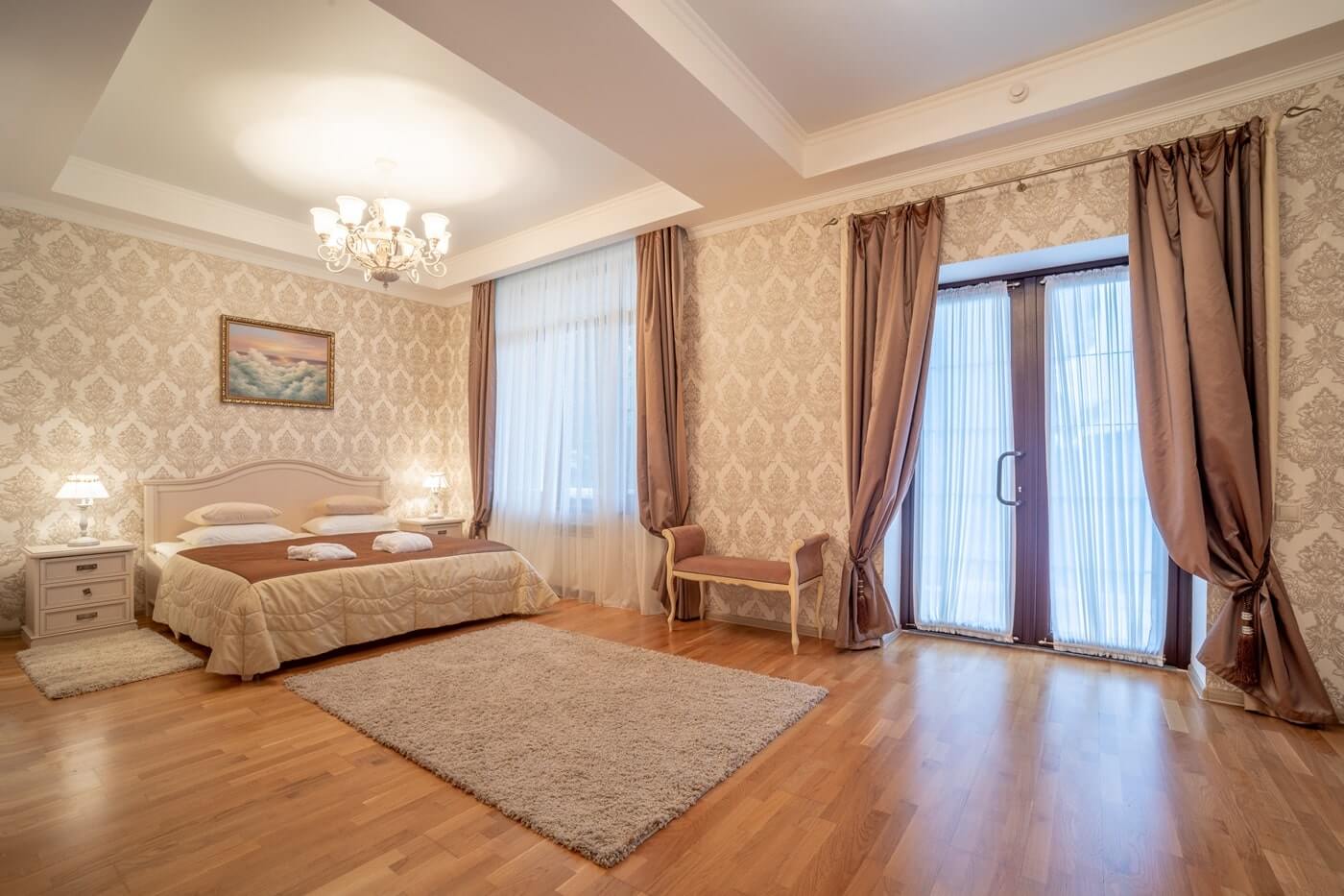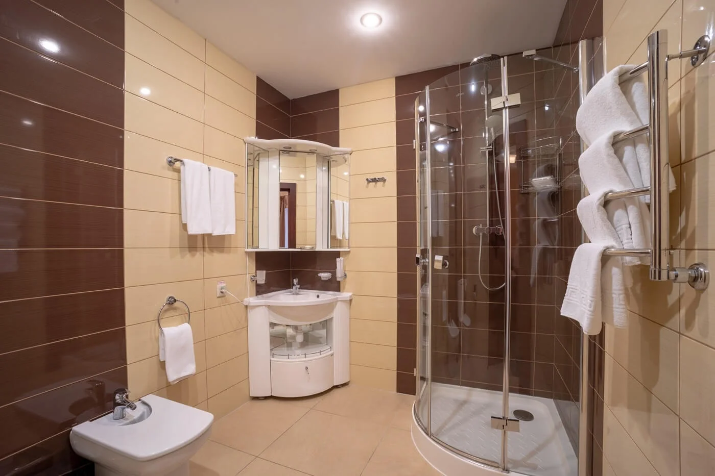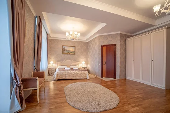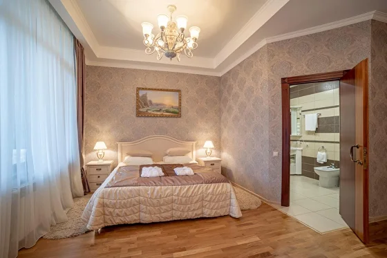 В 2х ванных комнатах: душевые кабины, биде, фен, наборы ванных принадлежностей, наборы полотенец, банные халаты, тапочки