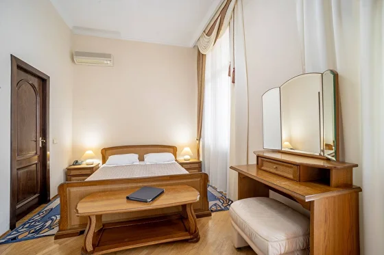 В номере: двуспальная кровать, раскладывающийся диван, журнальный столик, платяной шкаф, телевизор, телефон, холодильник, электрочайник, сплит-система кондиционирования