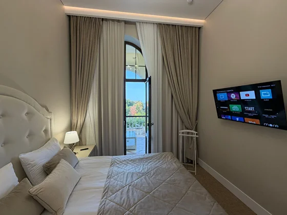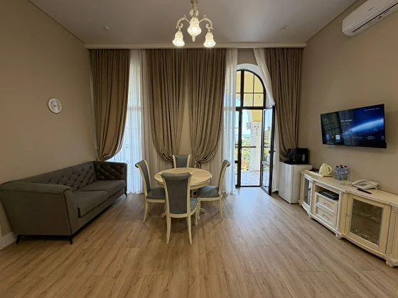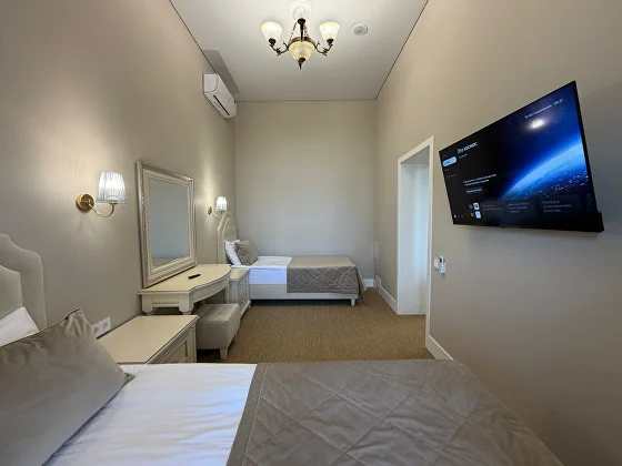 В номере: двуспальная кровать, 2 односпальные кровати, кофемашина, телевизор, телефон, холодильник, сплит-система кондиционирования, радио, индивидуальный сейф