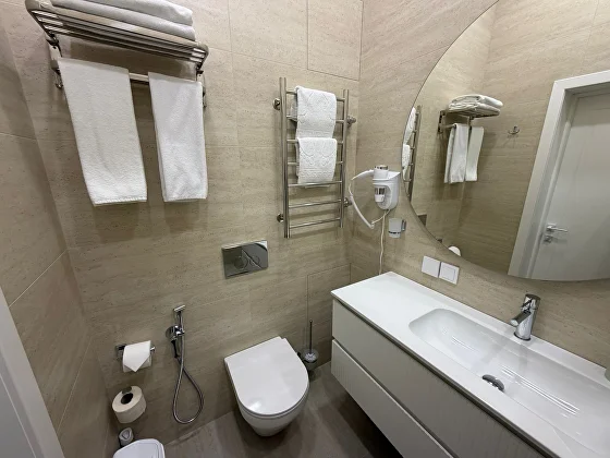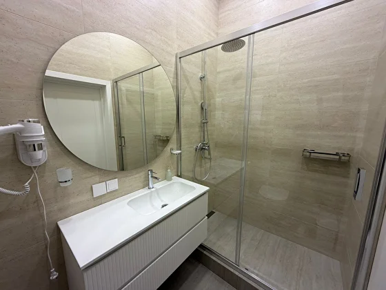 В ванной: душевая кабина, современная сантехника, фен, набор ванных принадлежностей, набор полотенец